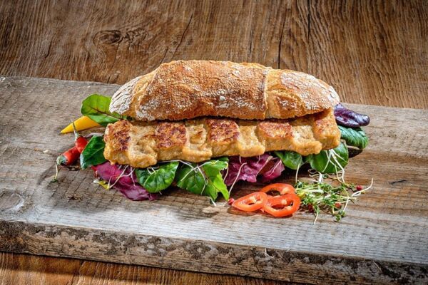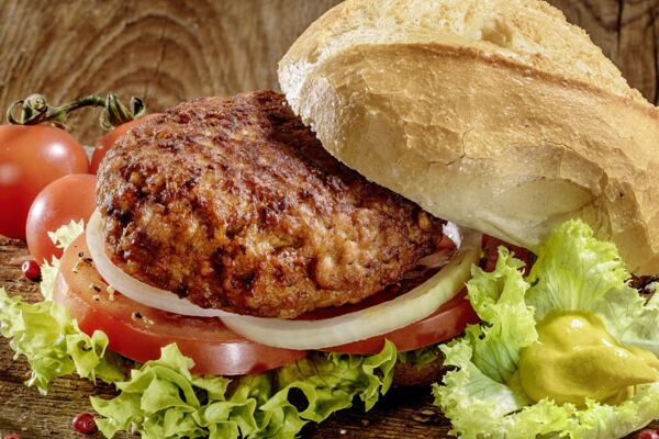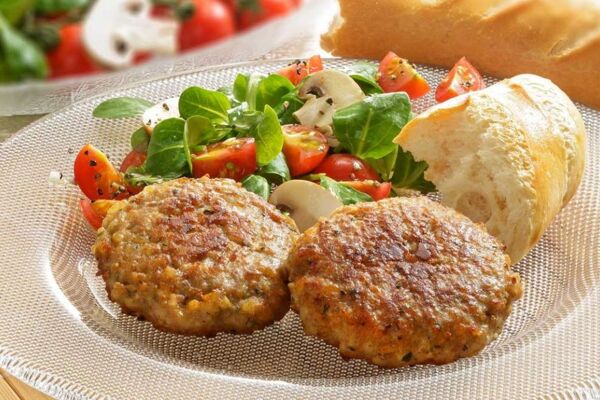 Burger uit vers kip- en kalkoenvlees, gebakken in koolzaadolie, I.Q.F. ingevroren en per stuk uitneembaar