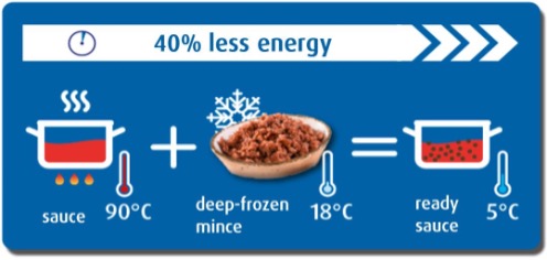 The IQF deep-frozen, loosely rolling meat chills the sauce down quickly and effectively – with 1/3 meat in the sauce, it halves the temperature almost immediately. The blast chiller does the rest.