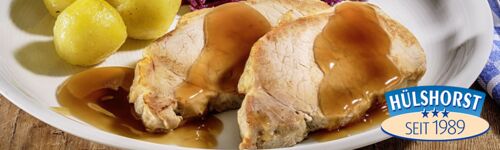 Made of fresh German pork loin, classically prepared, cut into slices and glazed. Versatile and really delicious, e.g. as a burger or with dumplings and gravy.