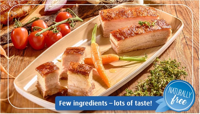 Pork belly – the juicy, fresh meat comes from the Westphalian country pig and is carefully cut in-house. Perfectly seasoned and gently sous-vide cooked, it is crispy and delicious after roasting.