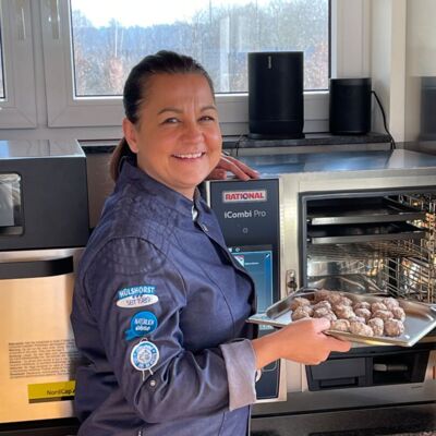 auf 120 °C (Garstufe Combi-Dampf) vorheizen, gefrorenes Produkt flach auf ein GN-Blech legen (bei großen Mengen schräg gefächert), ca. 15 Min. erwärmen, danach bei 150 °C (Garstufe trockene Hitze) ca. 4 Min. nachbräunen