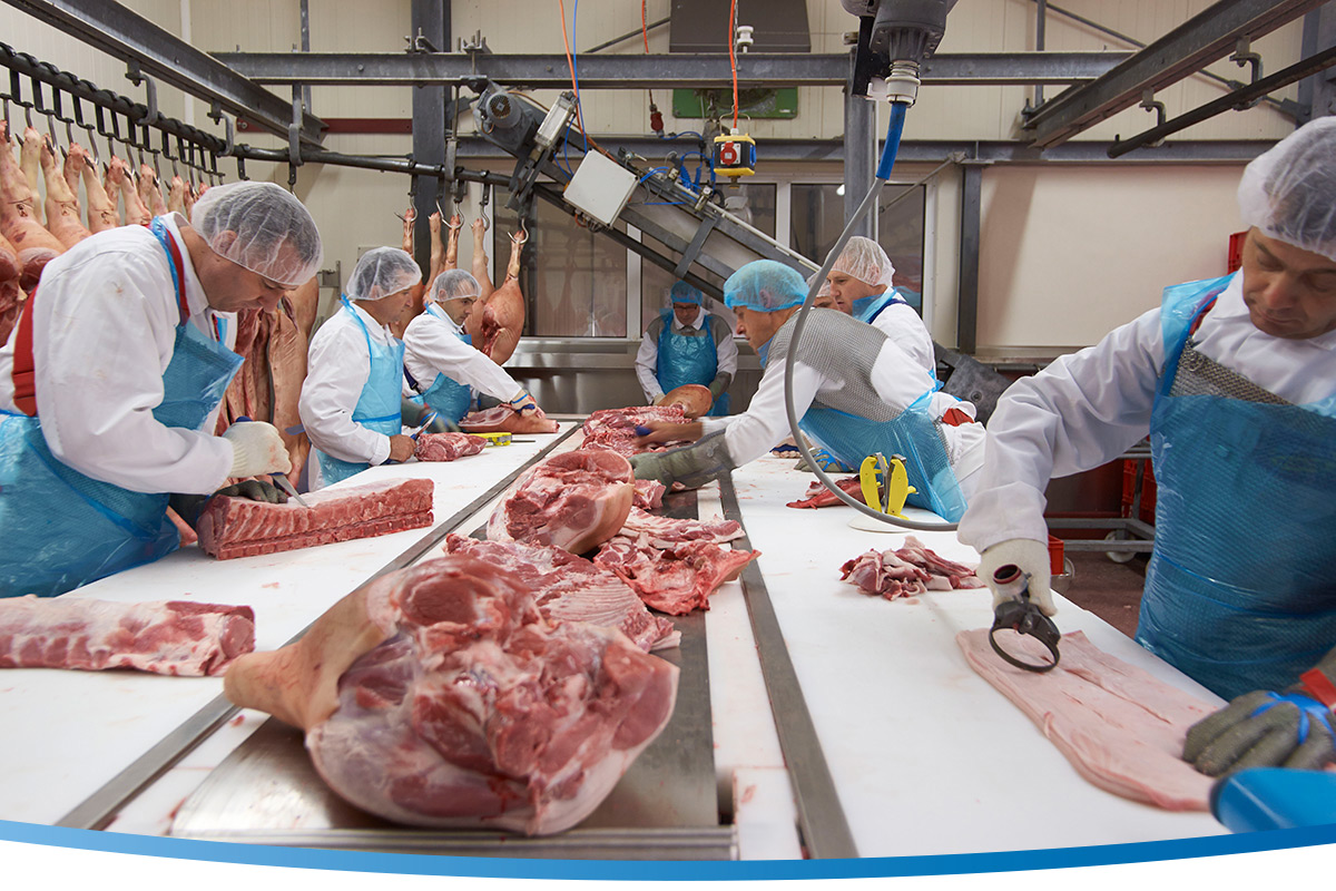 In ons snijproces worden de halve varkens afgesneden door getrainde medewerkers.